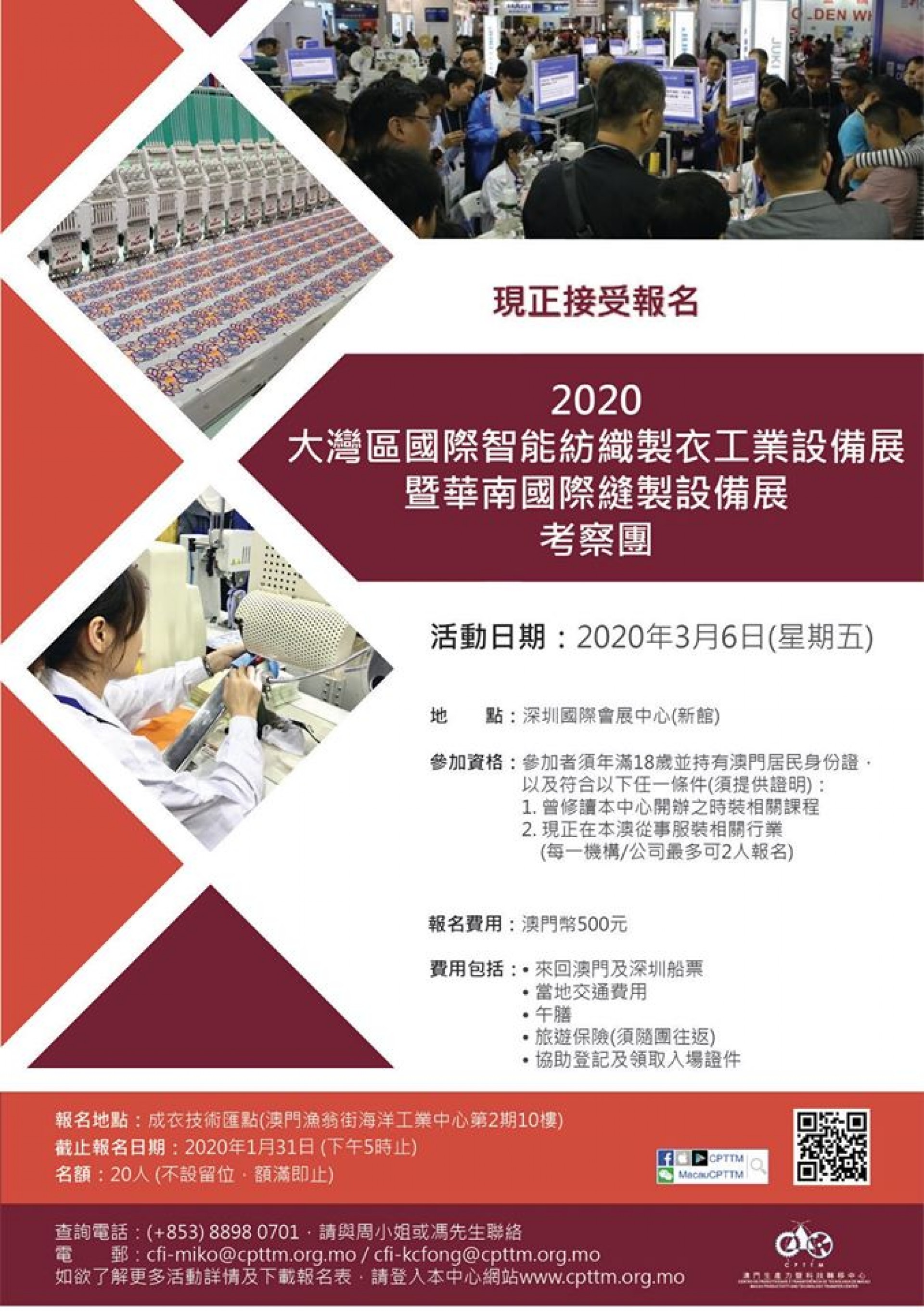 時尚從來都不是一成不變的,只有時刻關注時裝行業的技術發展,與時尚領域從業者的積極交流,才能緊跟時尚的潮流。為此,cC的小夥伴(澳門生產力暨科技轉移中心)將於3月6日組織「2020大灣區國際智能紡織製衣工業設備展暨華南國際縫製設備展」考察團,服務於本澳時尚業界人士。有興趣的朋友,速速報名呀。