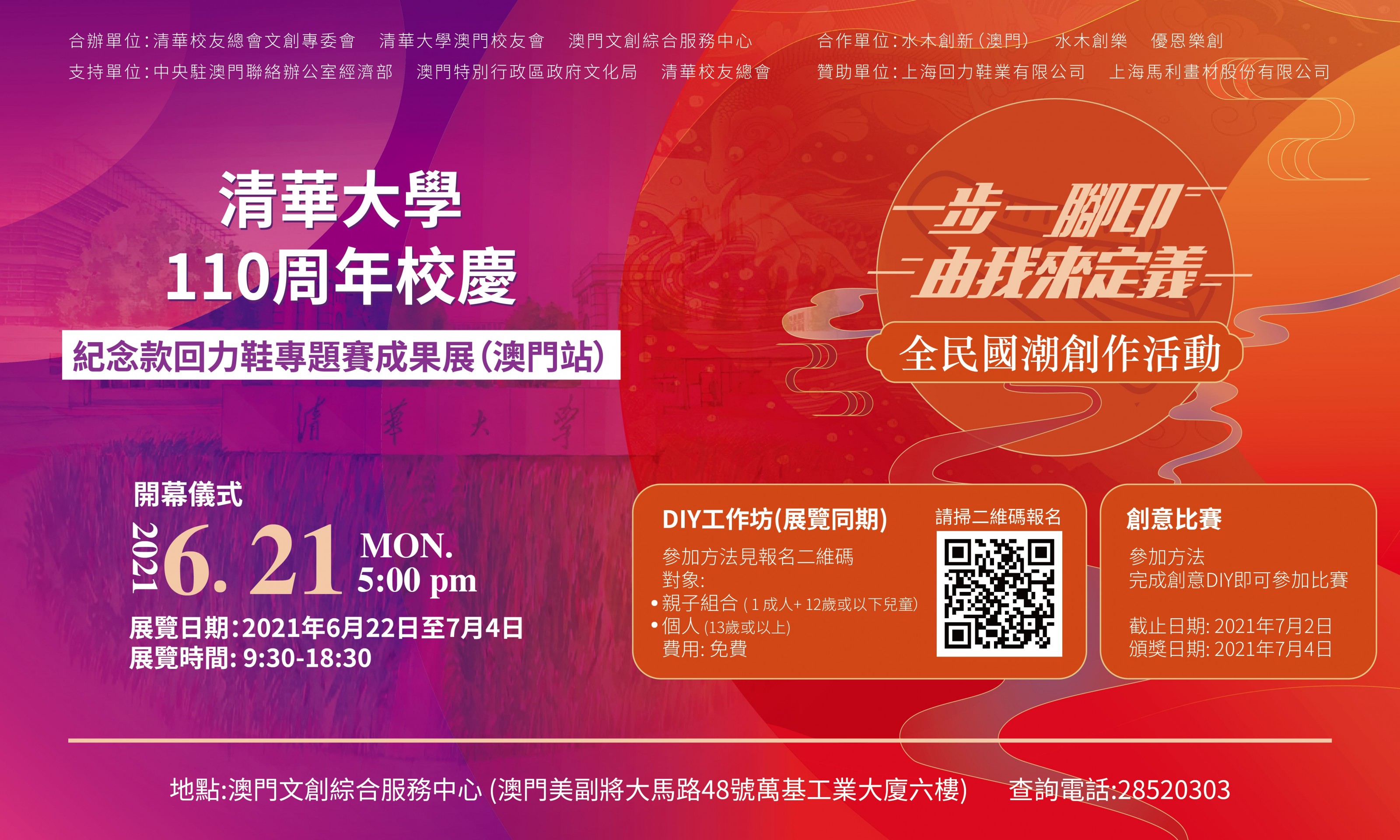 清華大學澳門校友會 將相關成果展引入澳門,並與清華校友總會文創專委會 、 澳門文創綜合服務中心 共同主辦清華大學110 周年校慶紀念款回力鞋專題賽成果展(澳門站),以及“一步一腳印 由我來定義”全民國潮創作活動,邀請澳門藝術家、青年文創人士和清華大學澳門校友會創作,並設有親子創作和市民創作空間由澳門市民用創作作品與百年國潮品牌互動,了解展覽傳達的自強不息積極態度。