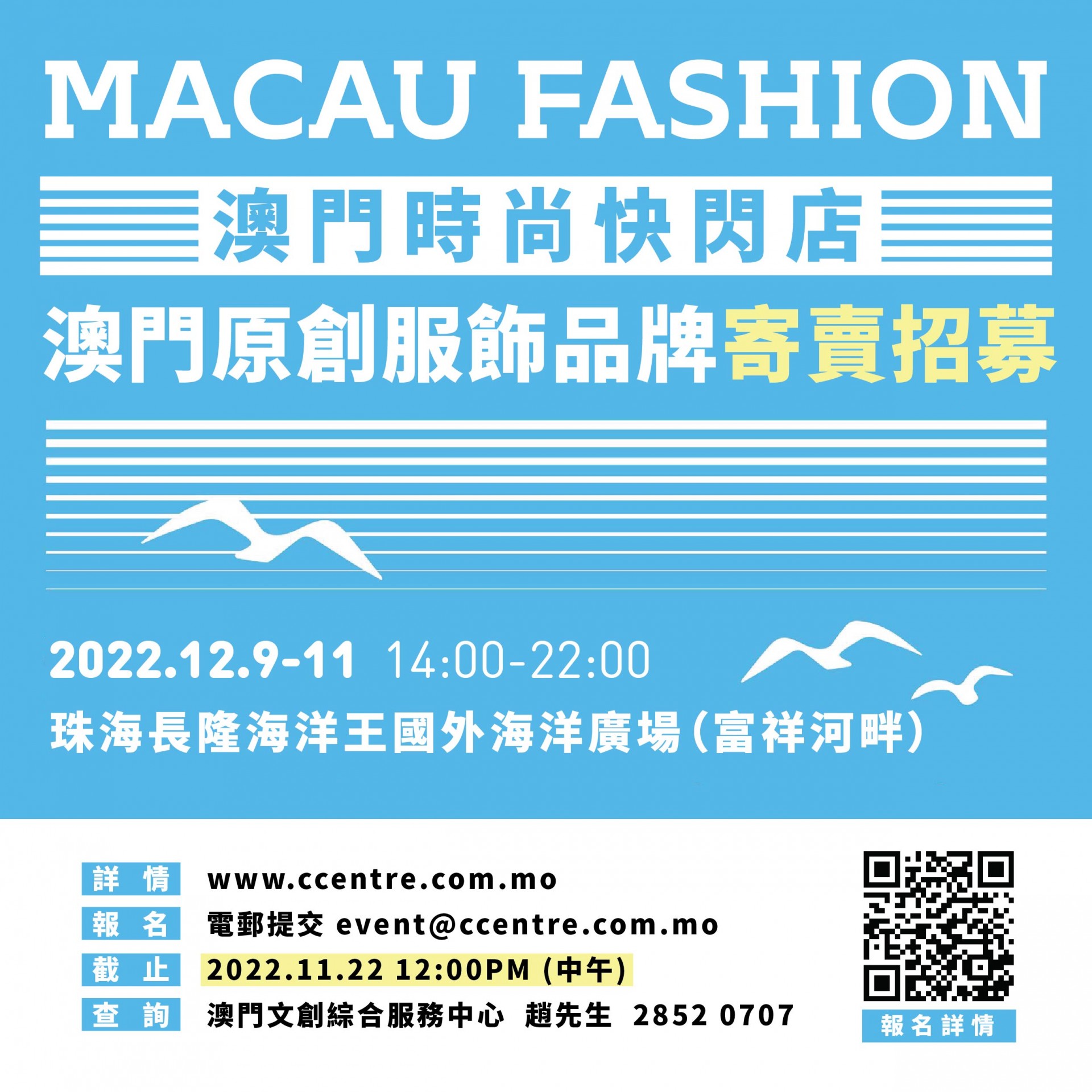 為進一步宣傳和推廣本澳原創服飾品牌,支持本地品牌“走出去”,拓展本地原創服飾品牌在粵港澳大灣區的銷售渠道,由澳門特別行政區政府文化局主辦的“澳門時尚快閃店”活動計劃於2022年12月9日至11日在珠海長隆海洋王國外海洋廣場 (富祥河畔)舉行,“澳門時尚快閃店”為獨立展銷營運空間,活動將與“澳門‧橫琴藝墟”同場舉辦,以發揮聯動效應。現正招募澳門本地原創服飾品牌,以寄賣形式參與,歡迎合資格人士報名參與,報名費用全免,銷售收益全數結算予品牌方。